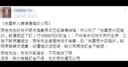 新郎已死婚紗業者拒退訂金表示「他女友還能用」,律師PO文卻遭網友反嗆:「訂金本來就不能退!」