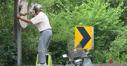 看過太多車禍74歲老伯6年擦拭8萬片反光鏡拯救無數性命,從梯子下來的模樣真讓人心疼!