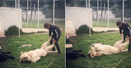白獅子做腳底按摩 秒變小貓咪「爽到吃手手」地上翻滾:太蘇湖了啦~