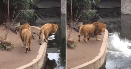 獅王散步沒踩穩變「落湯貓」 同伴岸上猛看:快起來很丟臉欸~