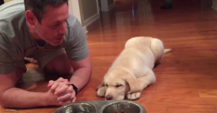 影/小拉拉跟著主人飯前祈禱 乖乖趴地上直到「阿門」:終於可以吃啦~