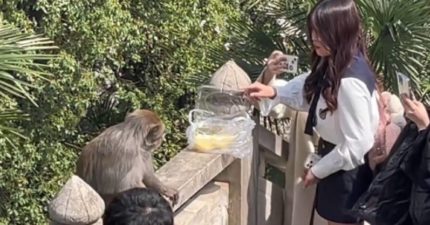 禁止餵食!妹子硬拿食物放欄杆 野生獼猴「秒轉身打臉」:巴呼妳卡清醒勒