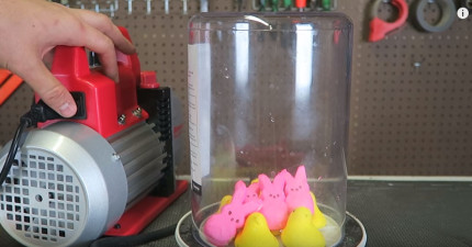他把兔子棉花糖放到容器裡然後用機器把空氣全都吸出來,我完全不知道會發生這麼爆笑的變化!