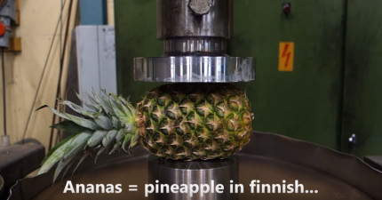 他們按照順序用液壓機把鳳梨、香蕉、西瓜、椰子壓爆,光看到把鳳梨壓爆的神奇景象我今天已經不用吃止痛藥了。