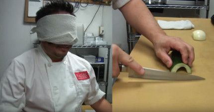這名神級廚師被挑戰矇著眼睛切片黃瓜,我本來會覺得會切得很慢很粗糙,但他一開始我就看到人跟神的差別!