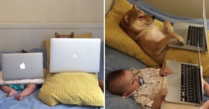 影/寶寶跟柴柴「用電腦追劇」 最後「抱著看戲」比情侶還甜蜜❤
