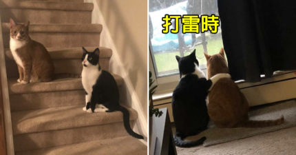 同伴怕打雷!貼心貓「手搭肩膀給安慰」畫面超暖❤