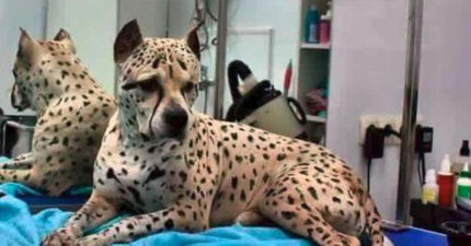 第一眼還以為是花豹,他是世界最稀有「花紋比特犬」!但看看他躺的地方…