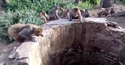 猴子群聚井口邊嘰嘰喳喳 遊客驚見「叢林王者」落魄困在井底!