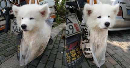 中國驚見薩摩耶「被裝塑膠袋」掛摩托車載去”賣”,「擺臭臉抗議」網友笑說:「活該!」