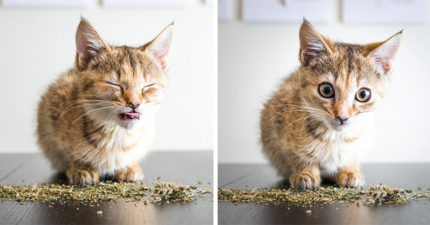 攝影師拍下貓咪吃貓草瞬間照 虎斑喵秒融化:阿~爽到飛