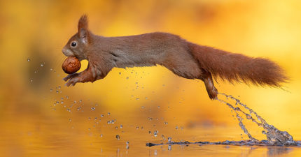 神手捕捉「松鼠啃堅果」夢幻照 毛球「水面倒影」像在看繪本!