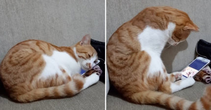 橘貓抱手機「緬懷過世主人」 上萬網友感動落淚…放大螢幕愣了