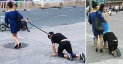 中國男生被女子當街「用狗鍊牽著狼狽爬行」抬不起頭,女子笑說:「這是我家的狗」。