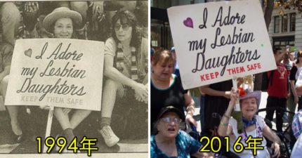 這位高齡92歲女士已經「超過30年都舉著相同的板子」參加同志遊行,大家看到板子上的字都激動地上前擁吻她!
