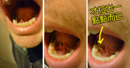 男子舌頭底下延伸出來的「口結石」,「等整條拉出來時」你吐完後就會開始狂喝水!